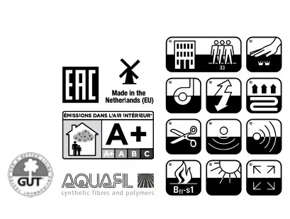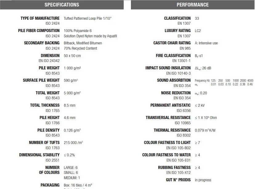 1000 გრამაჟიანი, 33 კლასის ფილები ზომით 50x50 სმ. 100% ნეილონის ფერში მოხარშული ძაფით, რომელიც გამოიყენება მძიმე კომერციულ ადგილებში - ასევე რეკომენდირებულია სასტუმროშიც.
