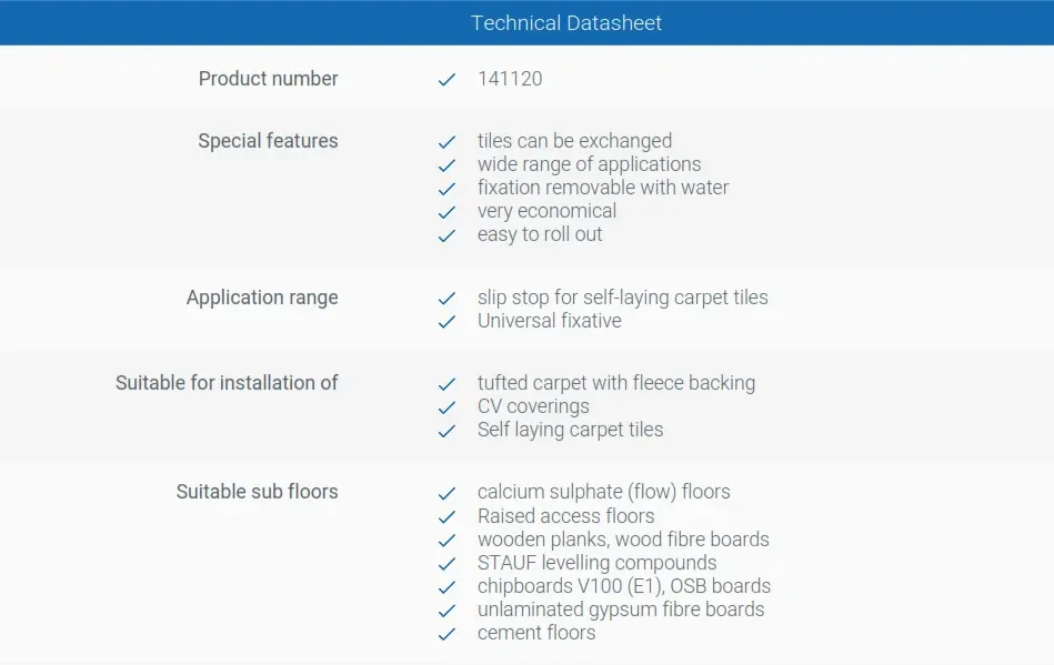 გერმანული STAUF CT Fix წებო, გამოიყენება ხალიჩის ფილების, რულონისა და ვინილის ფილების დასაფიქსირებლად.წებო არ აზიანებს მის ქვემოთ არსებულ იატაკს, თბილი წყლით ნეიტრალდება და სცილდება. მუშაობს იატაკქვეშა გათბობაზეც.გასაშრობად საჭიროა 4 საათი და შემდგომ აგებთ ხალიჩას.ფასი 330 ლარი ექვივალენტი ლარში